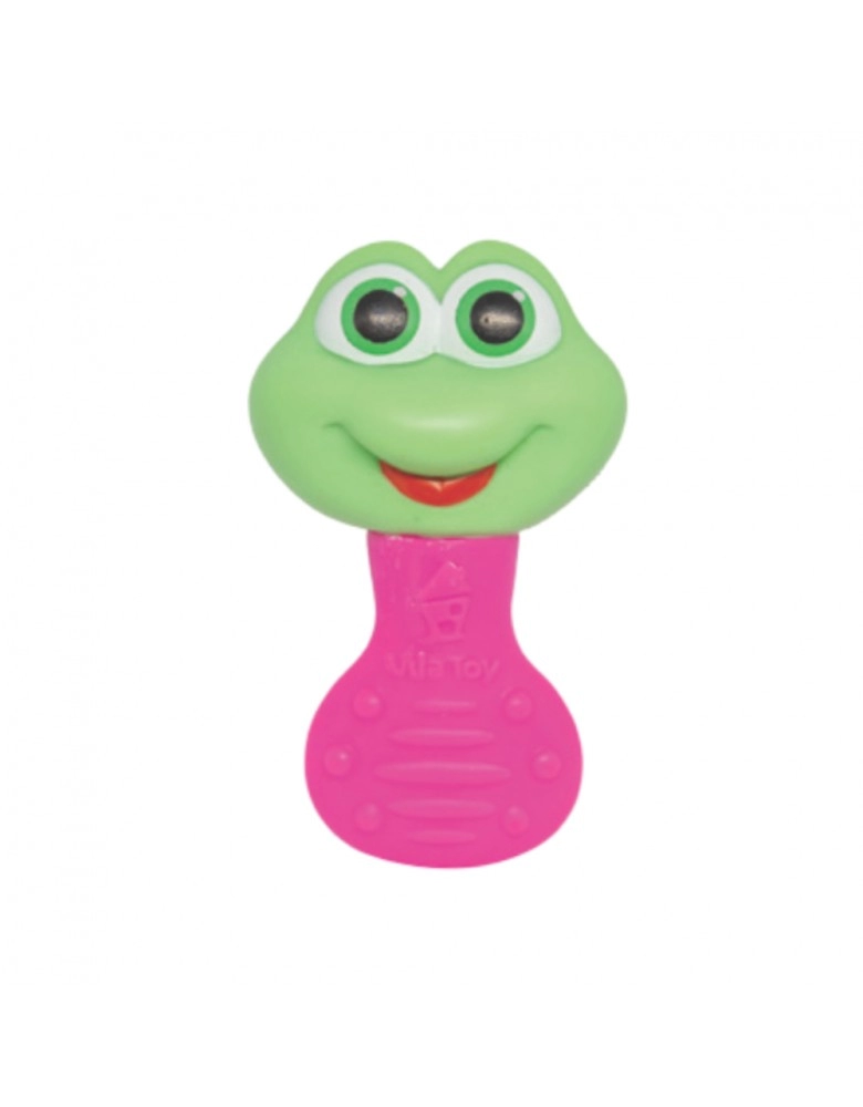 BRINQUEDOS>PRE-ESCOLAR>MORDEDOR>MORDEDOR E CHOCALHO SAPO ROSA/100-331
